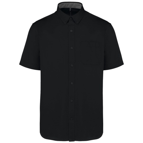 It's a short-sleeved shirt with a peach skin feel fabric, a button-down collar, and tone-on-tone buttons.