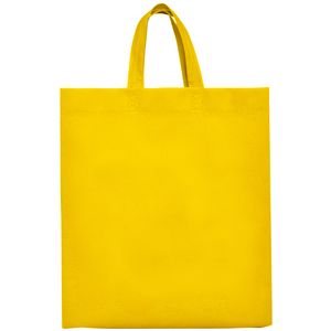 Heat-sealed bag with gusset on the sides and base, and matching short handles, made of non-woven fabric.